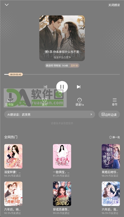3、等插件装好后,页面就会自动跳转到听书模式。在屏幕下方你可以根据自己的喜好,挑选不同音色、不同语调的AI主播来给你念书,非常有代入感。