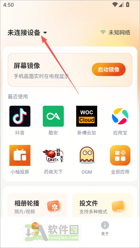 2、打开小柚投屏App,首页会显示“未连接设备”,点进去开始配对。
