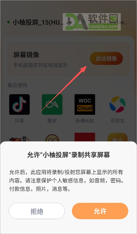 4、接着点击“启动镜像”,系统会弹出权限请求,允许小柚投屏录制屏幕内容——这是安卓系统的正常机制,点“立即开始”就行。