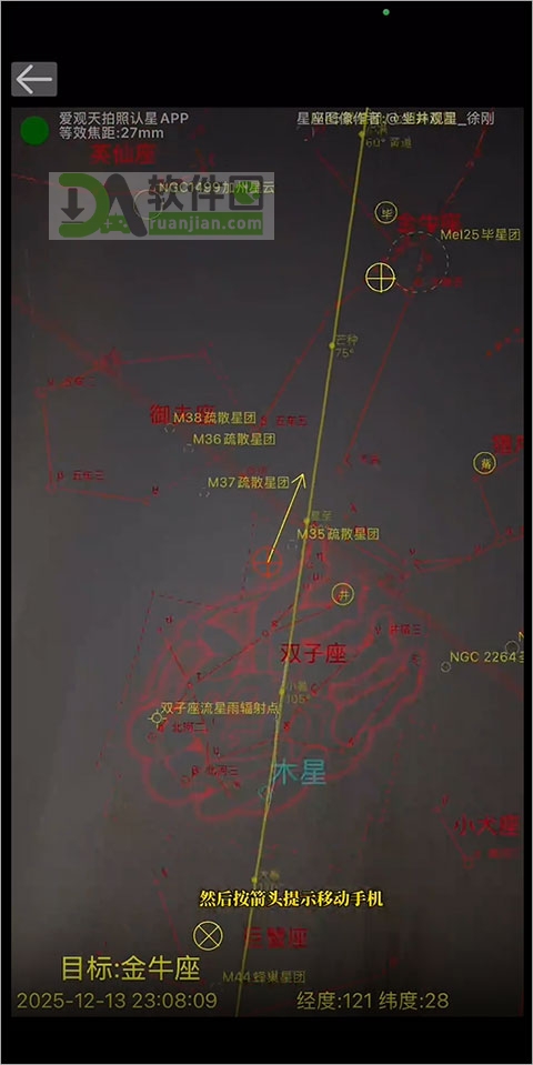 4、跟着屏幕上的箭头移动手机,直到目标出现在中心——这时候你看到的,就是它此刻在真实天空中的位置。