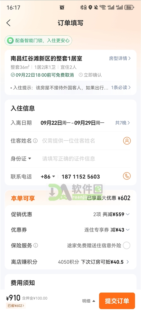 3、填写入住日期、离店日期和个人信息,确认无误后完成支付。