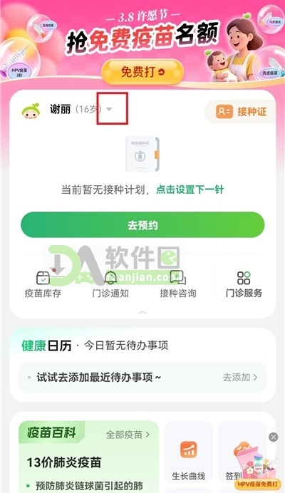 1、打开小豆苗后,先看看页面顶部显示的孩子姓名旁边,有个小小的倒三角符号,点击它。