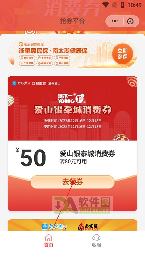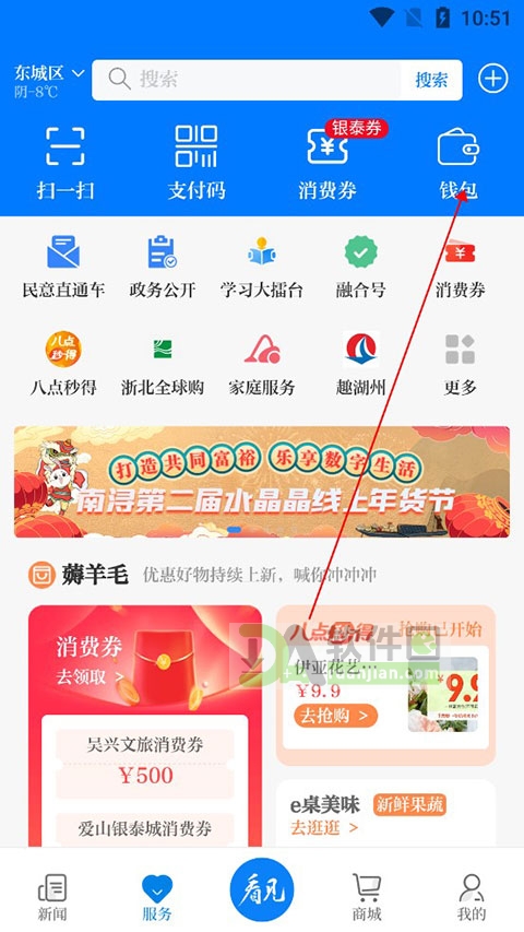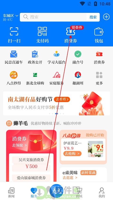 1、打开App,点底部“服务”,找到“消费券”进去就行。