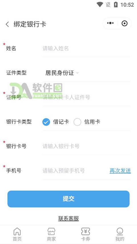 3、依次输入姓名、卡号、身份证、银行类型,还有办卡时留的手机号,确认无误后点提交,绑卡就完成了。