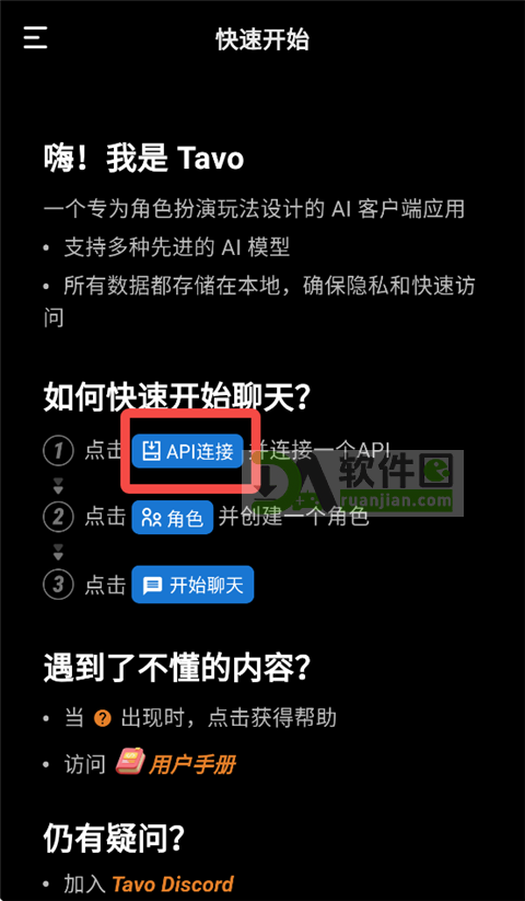 1、打开Tavo,首页就能看到醒目的蓝色【API连接】按钮,点进去就行。