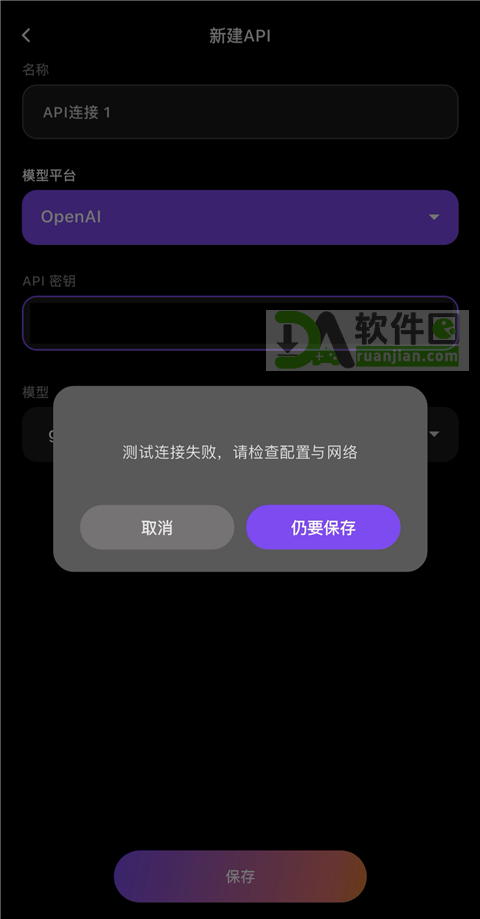 5、如果用的是海外模型(比如OpenAI),保存时提示连接失败,大概率是网络问题,这时候打开加速工具再试一次。