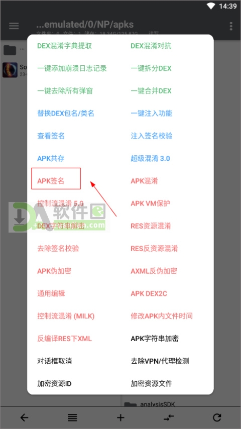 4、点【功能】→ 找到【APK签名】选项。