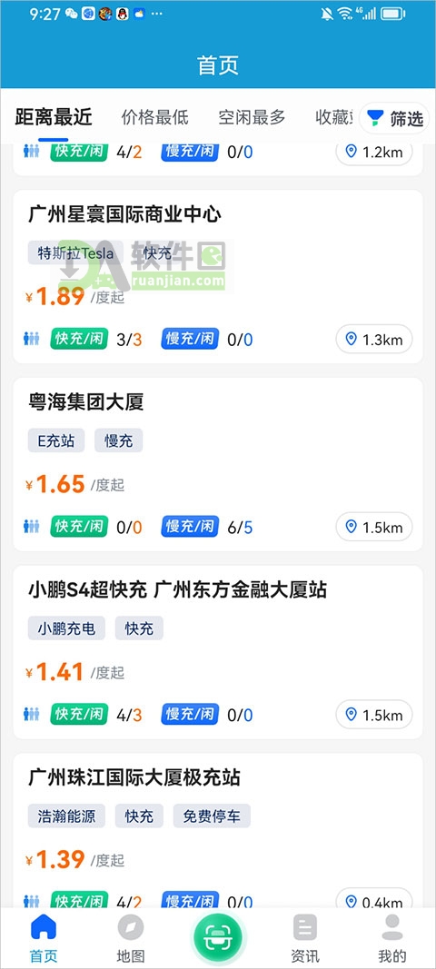 3、开启手机定位权限,首页会自动推荐你附近的可用充电桩,列表清晰、状态实时;