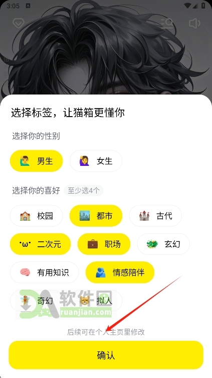 1、下载安装并打开app,首次进入需选择至少4个兴趣标签(如“科幻”、“恋爱”、“悬疑”等),点击确认,系统会据此为你匹配初始角色;