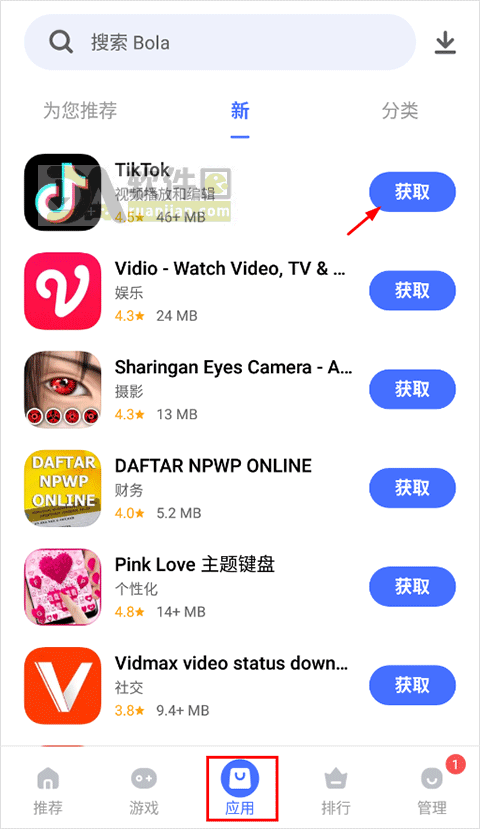 3、点进任意应用详情页,确认权限和评分后,点击“获取”即可开始下载。