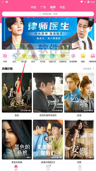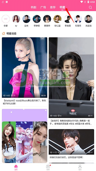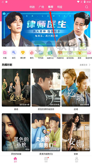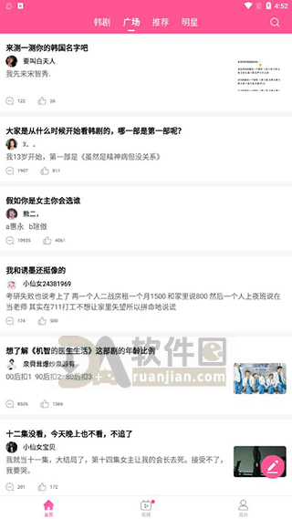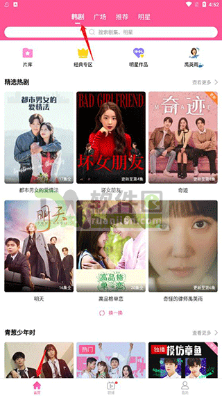 1.首页四大入口:打开APP即见「韩剧」「广场」「推荐」「明星」四大板块,结构一目了然。