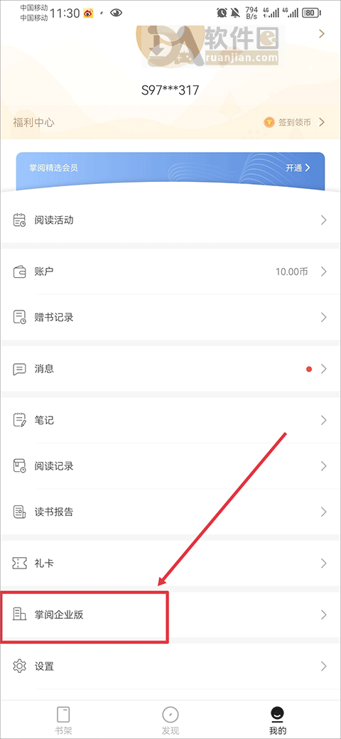 1、进入【我的】→ 点击【掌阅企业版】;
