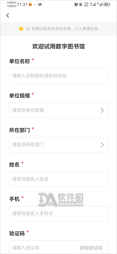 3、填写单位名称、规模、部门等信息,提交申请;