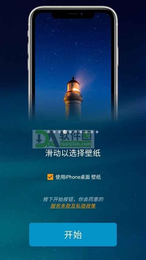 1、下载安装完成后打开应用,先滑动挑选一张喜欢的壁纸,点“开始”进入下一步。
