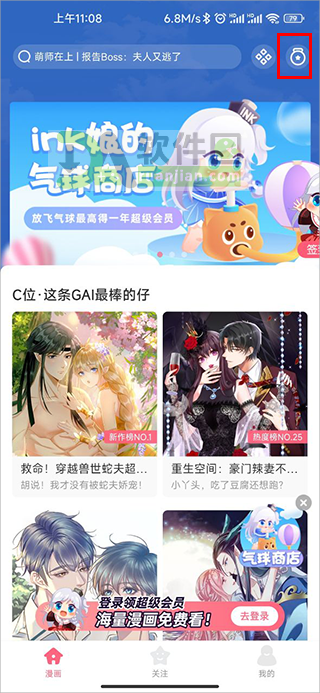 1、打开App后,首页顶部有搜索栏,输入漫画名、作者或关键词就能快速定位。