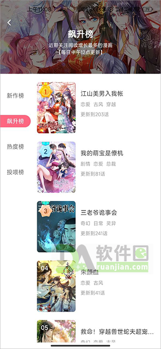 2、如果不知道看什么,点“榜单”看看大家都在追哪些——热度榜、新作榜、飙升榜一目了然。