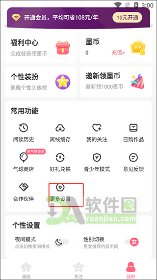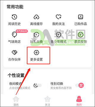 1、在“我的”页面,点开底部的“更多设置”。
