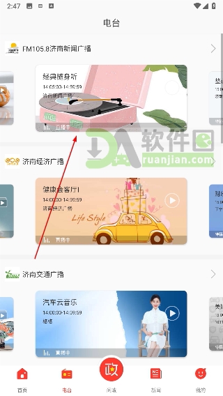1、先在首页或频道页挑一个想听的电台节目,点进去开始播放。