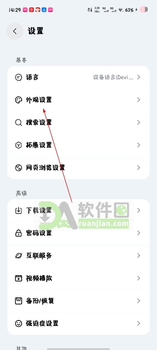 3、往下滑或者直接找“外观设置”这一项,点开后就能看到“菜单栏模式”这个选项。