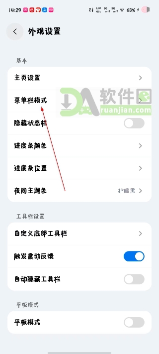4、在外观设置页面里,再次点击“菜单栏模式”,会弹出具体的选择界面。