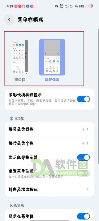 5、这时候你可以选“侧边栏”或者“底部弹出”两种布局,选完就自动生效,下次打开菜单就是新样式了。