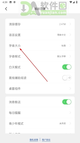 3、在设置列表中,找到“字体大小”这一项,点击进入调整界面。
