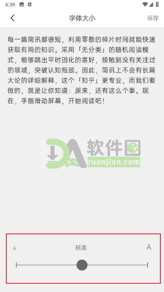 4、拖动屏幕上的滑块,实时预览文字变化,调到自己看着舒服的大小后,点击“保存”或直接返回即可生效。
