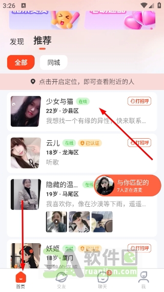 1、打开首页,系统会推荐一批在线用户,滑一滑看看谁合眼缘,点进对方头像就能进入个人主页。