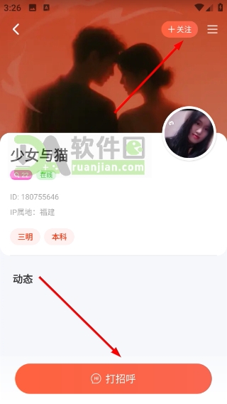 2、在个人主页上,直接点“关注”按钮就能成为TA的粉丝;如果想马上聊天,也可以点“打招呼”,发一句开场白试试水。