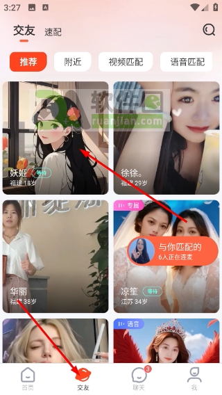 3、想更快匹配?点底部“交友”入口,进入速配页面,系统会按兴趣标签推荐用户,看中谁就滑右或点“喜欢”,双向匹配后就能开聊。