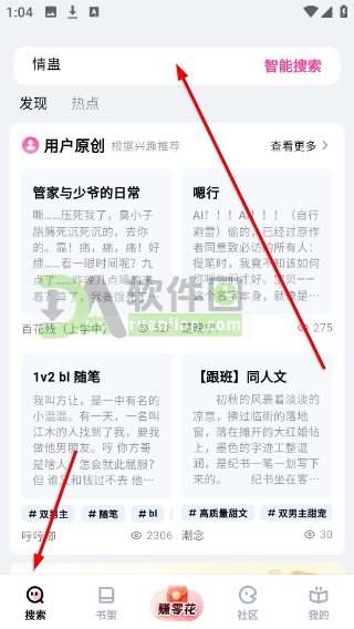 1.打开App进入首页,你可以先浏览推荐内容或用户原创作品;想直接找书?点击底部导航栏的【放大镜图标】(搜索按钮),进入搜索页面;