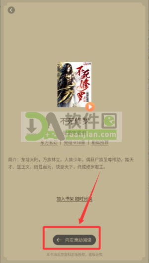3.根据页面提示,向左滑动屏幕即可进入正文阅读界面;