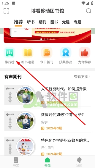 1.打开包元App(注:原文提及“博看移动图书馆”,但上下文明确指向“包元”,此处以“包元”为准),进入【书苑】首页,点击顶部的【排行榜】入口,进入热门榜单页面;