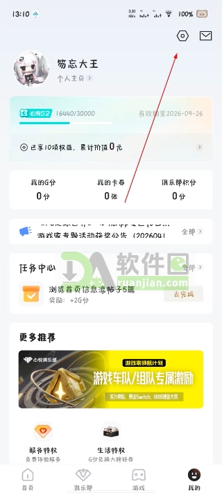 1.打开【心悦俱乐部】App,点击右上角的【设置】图标(通常为齿轮形状);