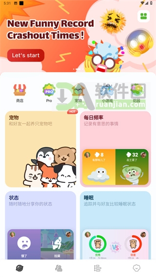 2、进入主界面后,首页会展示你养的宠物、今日互动频率、睡眠记录等核心模块;