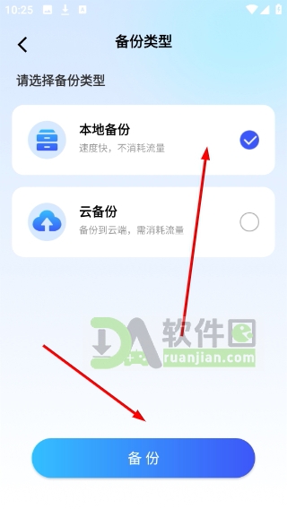 2、在备份选项页中,可选择“本地备份”或“云备份”,确认后点击【开始备份】启动任务;