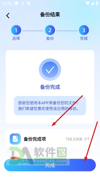 3、备份完成后,系统会显示本次成功备份的项目清单,点击【完成】即可结束流程;