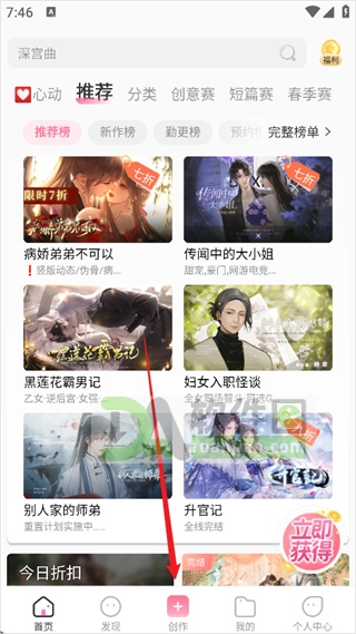 1、打开易次元App后,滑到下方功能栏,找到并点进“创作”板块;