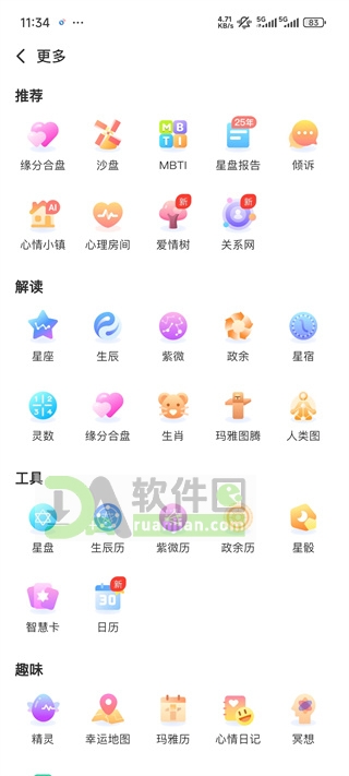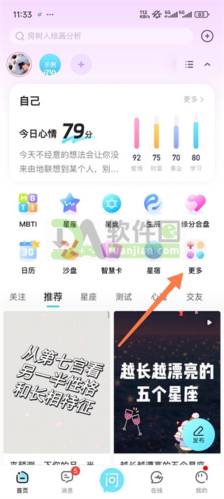 1、打开“测测星座”APP,进入首页后点击底部“更多”选项,进入完整功能页面。