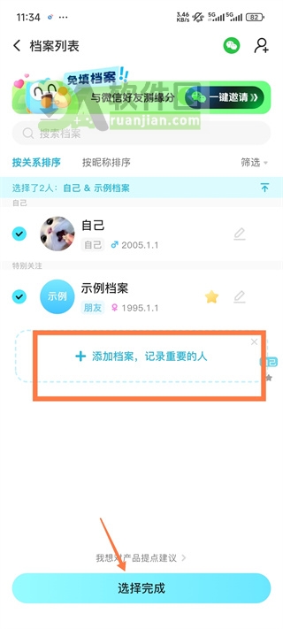 3、进入合盘页面后,系统会提示选择两个已保存的个人档案(通常需提前填写出生信息)。