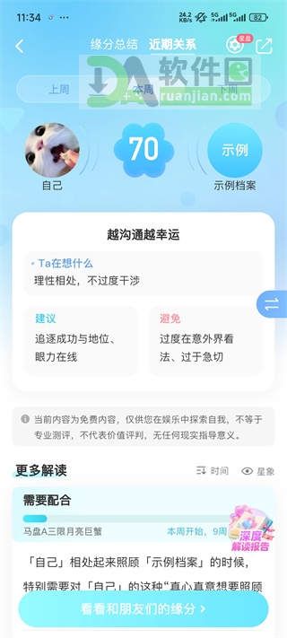 4、确认选择后,即可查看双方的近期关系趋势、性格契合度、沟通建议及整体缘分总结等内容。