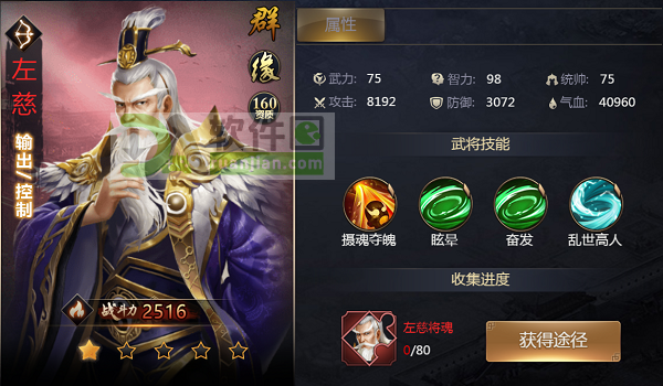 总结一下:左慈的主动技能和资质技能都还不错,缘分技能较为一般,可以给82分,很棒的武将!