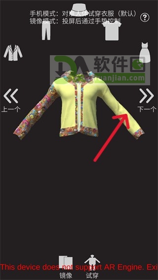 4. 点击底部“镜像”或“试衣”功能模块,切换查看模式:镜像模式模拟照镜子视角,试衣模式支持多角度观察搭配细节。