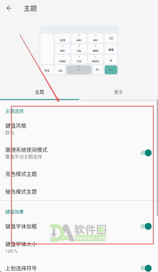 3、接着进个性化设置,调整键盘主题、字体大小、是否显示数字行、深色模式等,让键盘看起来和用起来都更合心意。