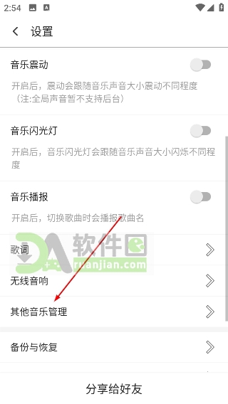 2、在设置菜单中,点击“其他音乐管理”选项,进入高级控制设置界面。
