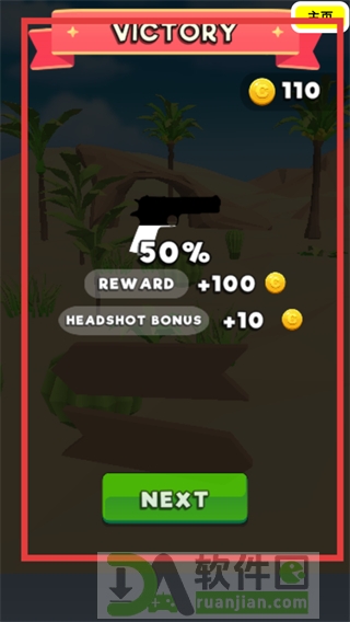 4、关卡成功后可得到基础奖励与爆头额外金币,点击next键即可前往下一关卡继续挑战。