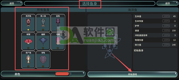4、在【选择鱼身】的界面上,选定喜欢的鱼类后仔细查看各项能力数据,确认选择合适后点击【开始游戏】按钮进入实际游玩环节。
