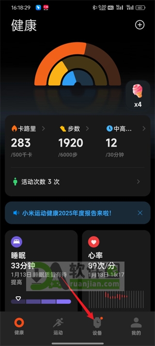 1、打开 App 后,点击底部导航栏的“设备”页面;