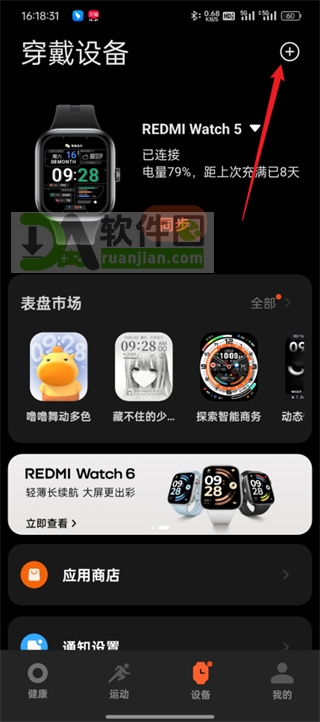 2、点右上角的“+”号,开始添加你的小米手环或手表;