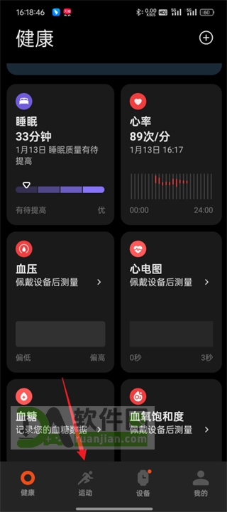 4、配对成功后,进入“健康”模块,就能查看实时心率、睡眠分析和身体状态评估。